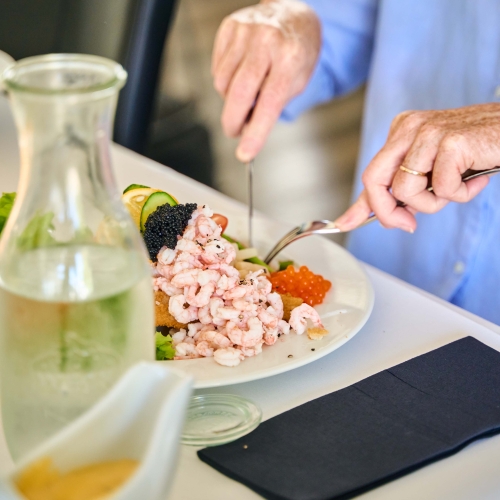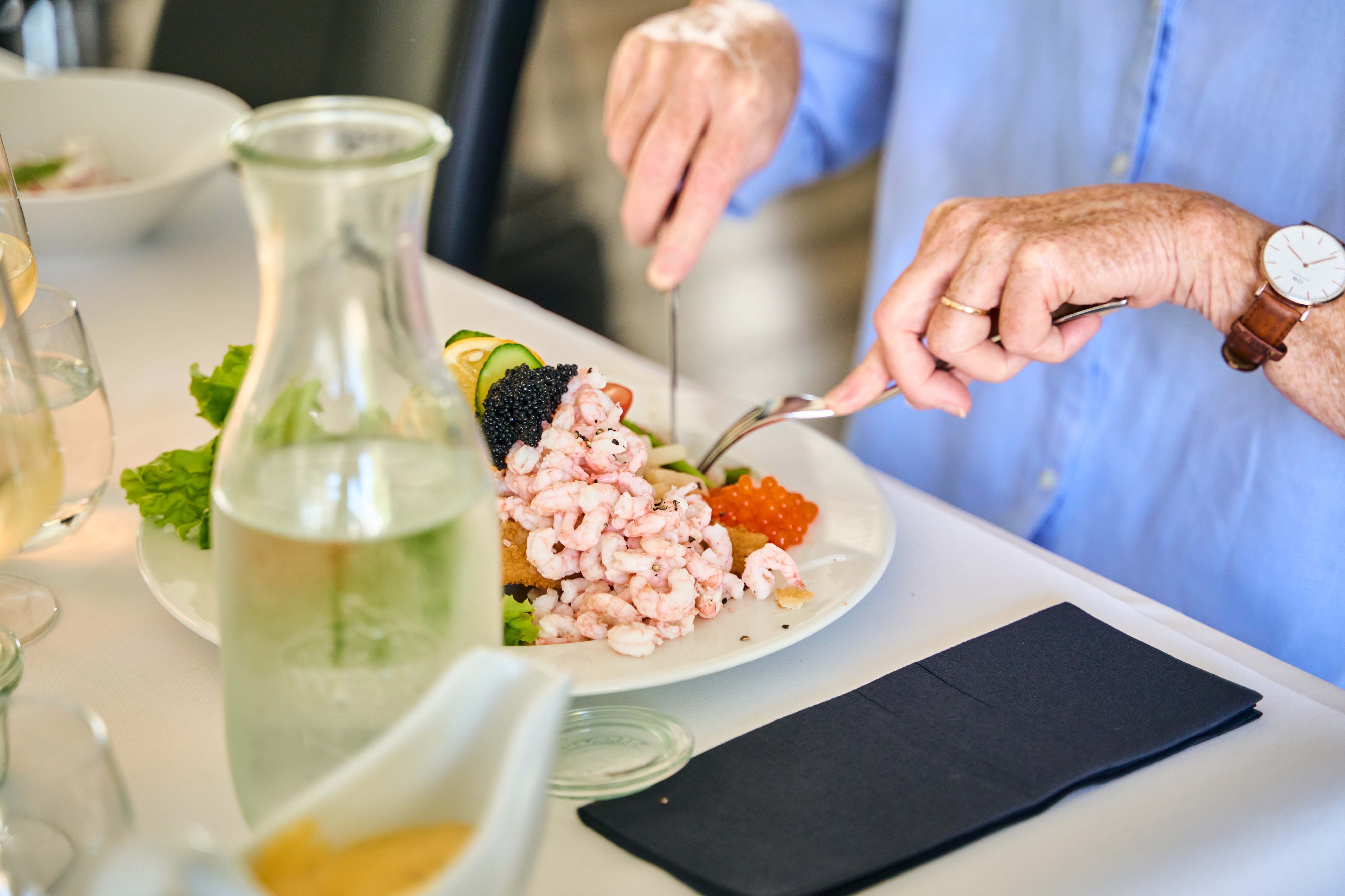 | Stjerneskud Rødspættefilet på smørristet brød med salat, rejer, asparges, tomat, citron, kaviart og hjemmerørt dressing |